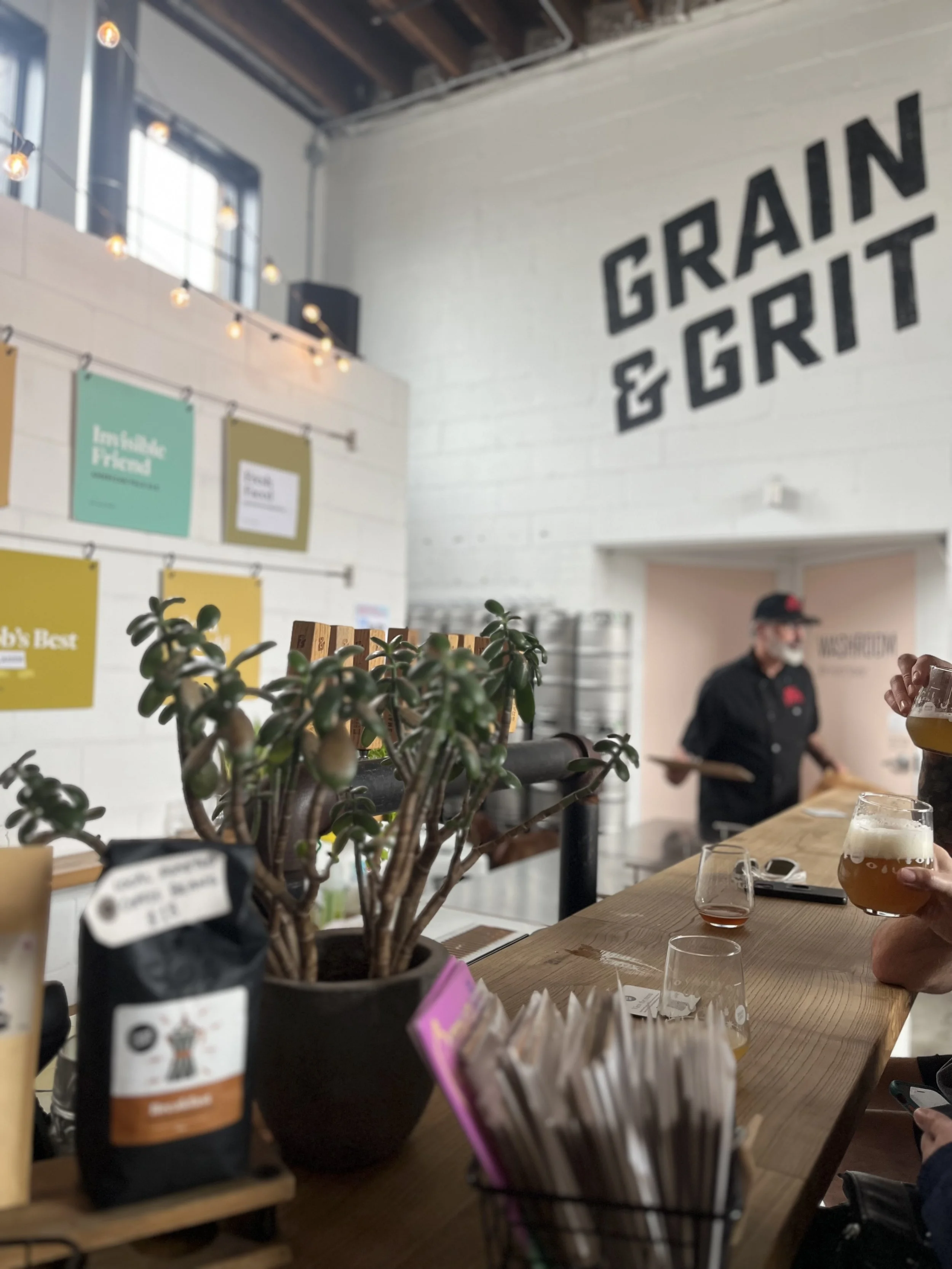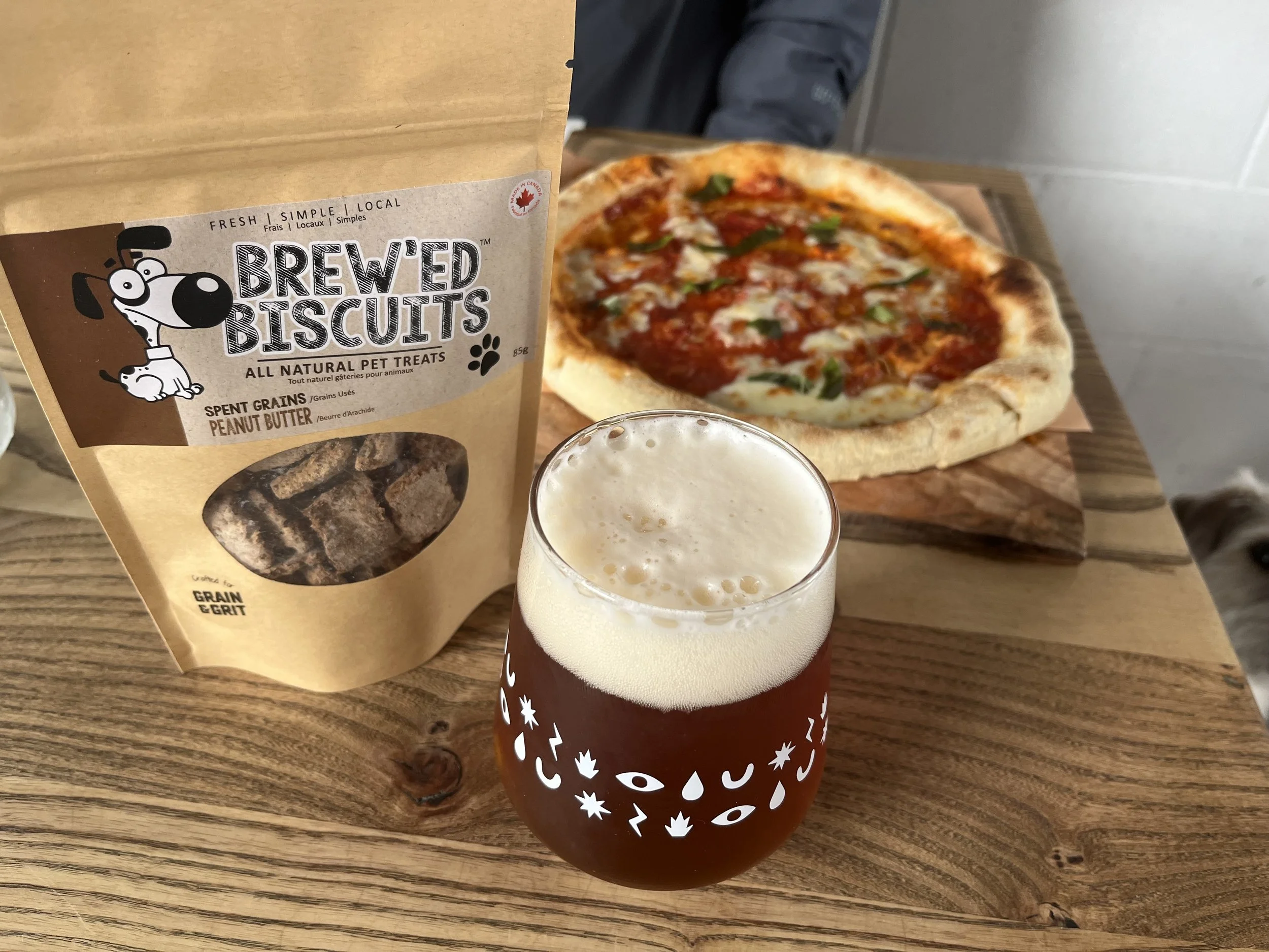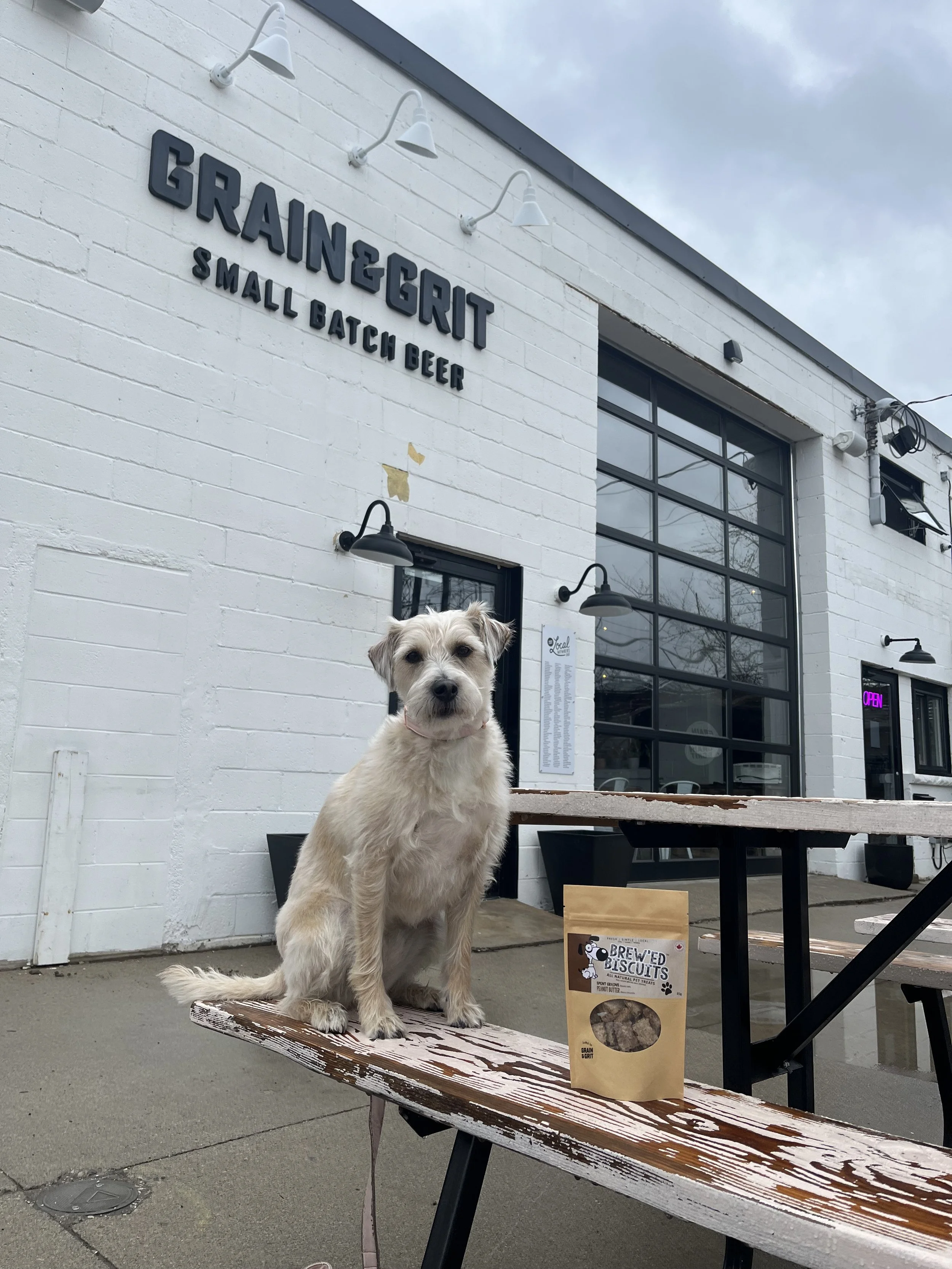 Grain and Grit We visited Grain and Grit on a drizzly day, so were extra thankful that dogs were allowed inside! There were a few other pups there too, so Rita was able to make friends. The brewery is quite small inside, but very fresh and funky-looking. On this particular day, they had a special pop-up with Red House Pizza Dundas, and although the cooking facility was an electrical pizza oven, it was very fresh and just what we needed after a nearby hike! They had a variety of non-alcoholic options and some Brewed Biscuits for Rita, made from spent grains left over from the brewing process. We purchased a bag to take home too!