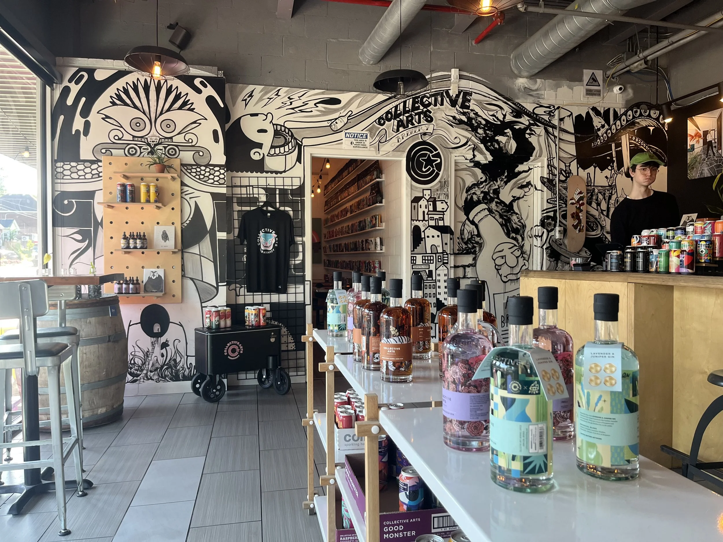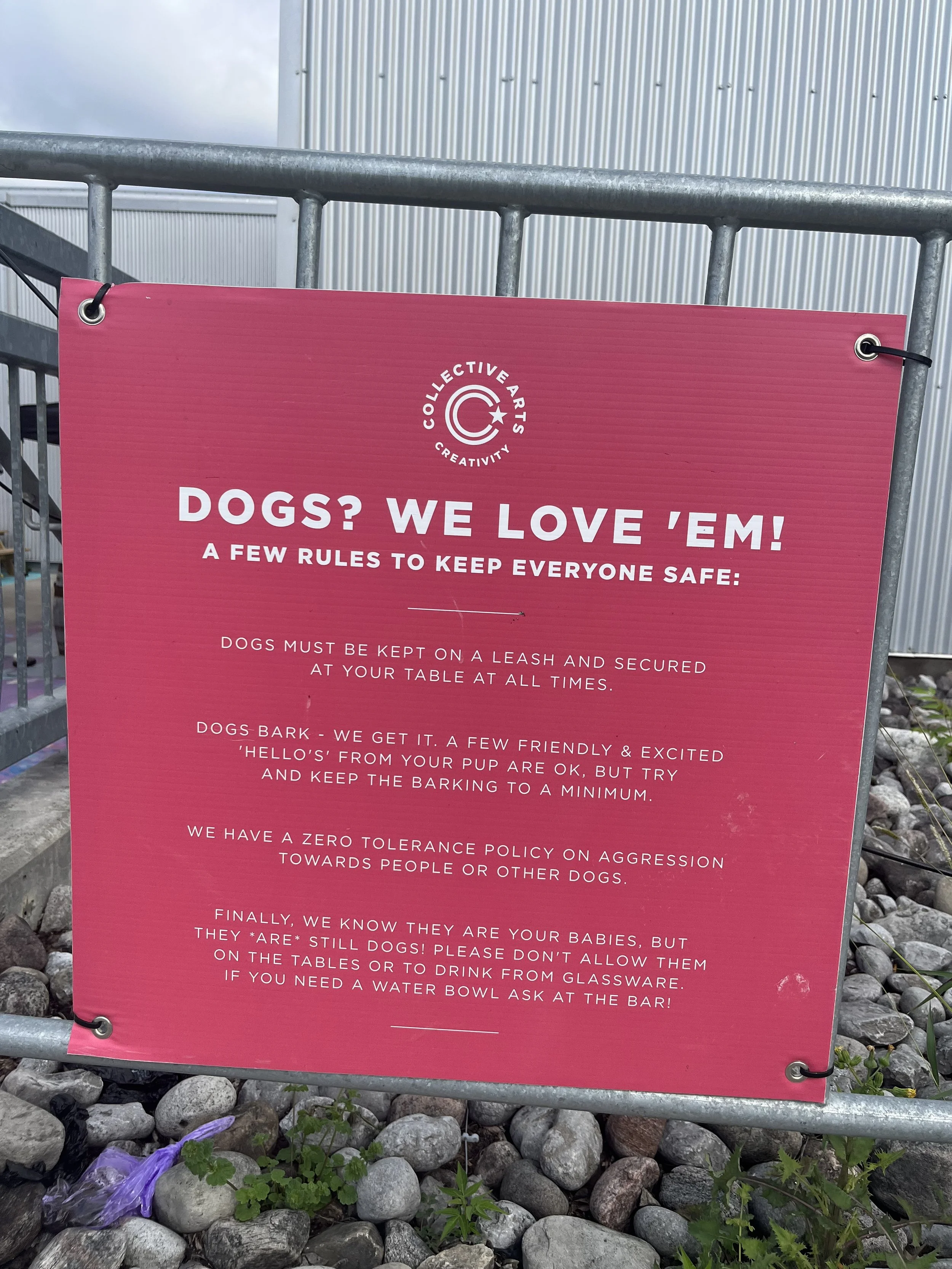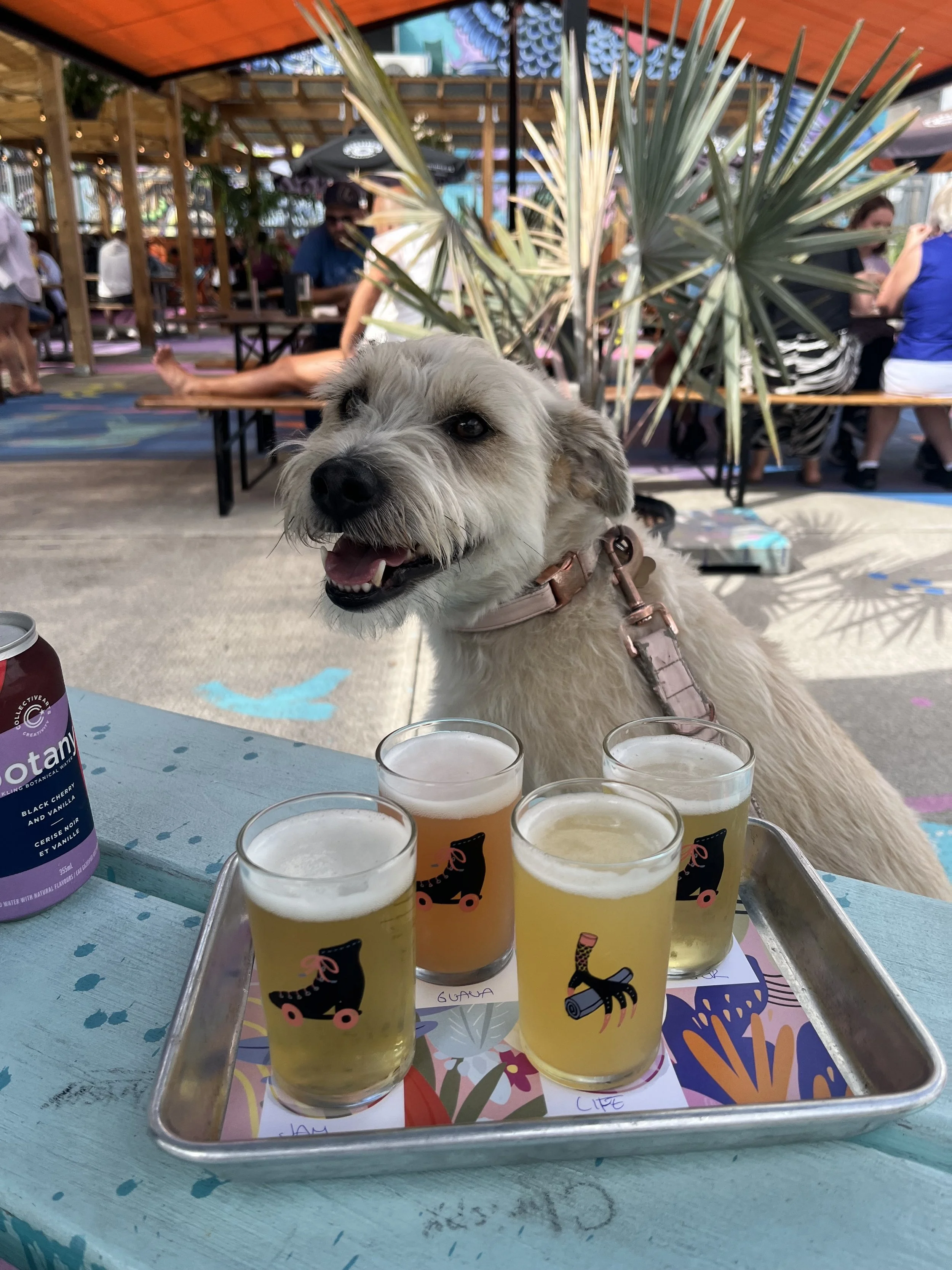 Collective Arts Brewery We paid a visit here after our hike around Cootes Paradise marsh. This brewery is dog-friendly inside and out. As it was a sunny day, we sat in the beer-garden. The Heartbreak Chef was there cooking up some delicious smelling (and, as we discovered, tasting!) nosh. I went for a veggie burger and grilled corn, while my friend opted for jerk chicken with rice and potato salad with a beer flight, followed by a pint of his favourite, Guava Gose. I was very pleased with the selection of non-alcoholic beers and sparkling waters. The dogs stuck to water. The whole concept revolves around artwork, showcasing modern pieces from artists around the world, both on the walls and on the glassware! With a stage setup inside, the location is also well-suited to live music – on our visit, there was a karaoke night about to begin. Afterwards, we visited the taproom around the corner and each purchased a 6-pack to bring home. Rita was eyeing up the artsy dog collars on sale too!